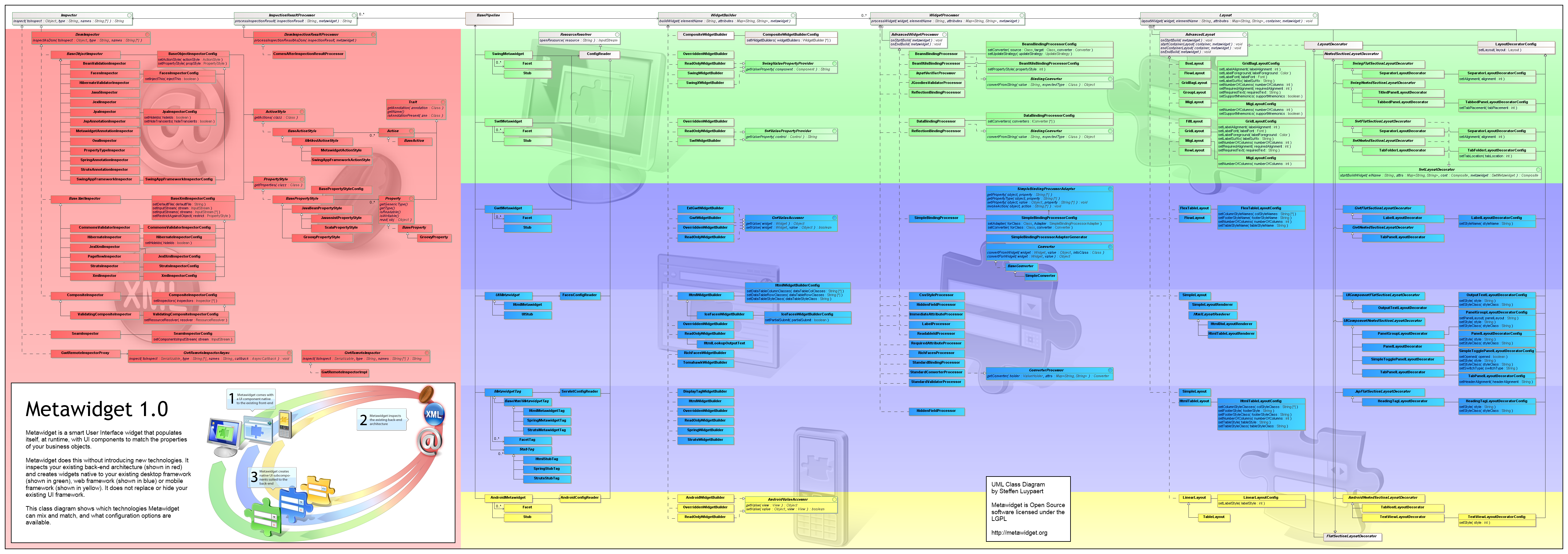 WallchartThe Metawidget wallchart is a large UML class diagram showing which technologies Metawidget can mix and match, and what configuration options are available. The wallchart includes all supported back-end technologies (shown in red), desktop frameworks (shown in green), web frameworks (shown in blue) and mobile frameworks (shown in yellow). It's a great tool for both familiarising yourself with the overall architecture of Metawidget, and for exploring what plugins are available. It is downloadable as a PNG image designed to be printed across two pieces of landscape A3 or A4 paper. Download the wallchart here. |